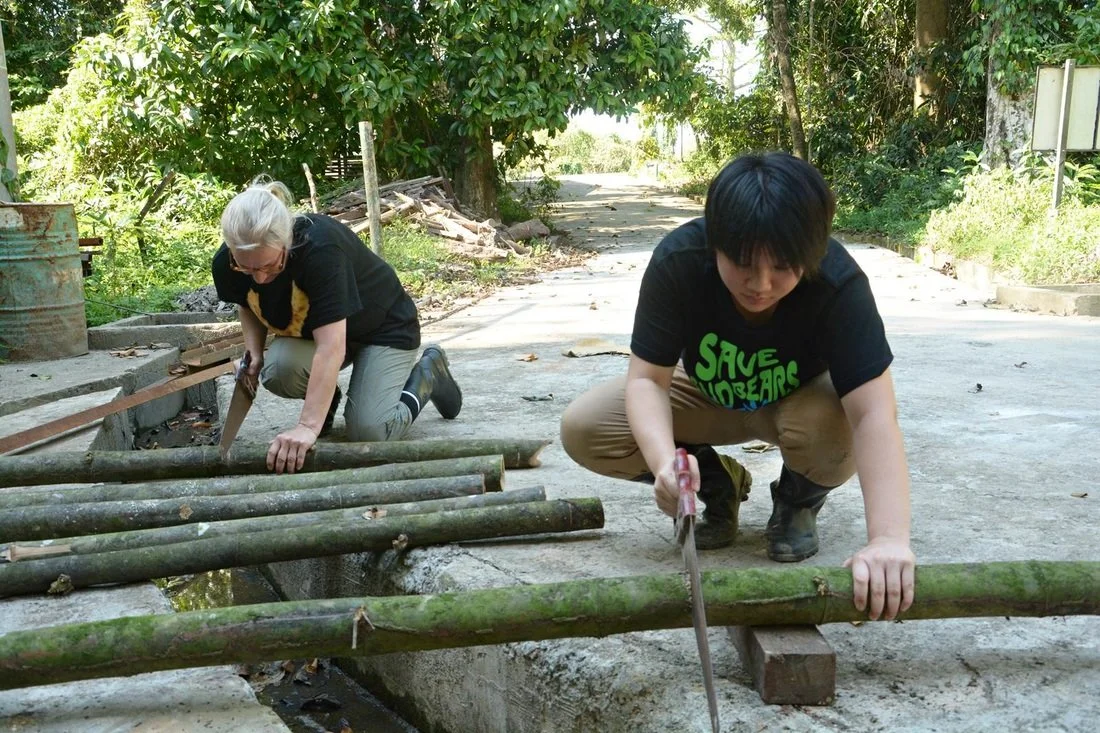 Among my favourite tasks as a volunteer was enrichment, which involves fashioning objects for the sun bears to interact with, be it a bamboo shoot filled with tasty fruit, or a bed of dried leaves to forage through. Enrichment gives the bears things to do, and teaches them to use their senses and bodies like they would in the wild, which was always fun to watch! My other favourite project was getting to decorate the bear house walls, upon the request of Lin May, one of the bear care staff. As someone who loves art, it was wonderful to be given the opportunity to contribute to the centre with my drawing skills. I painted a series of bears engaged in different enrichment activities, and sketched some more bears in the kitchen; these were then painted by Lester, another one of the BSBCC staff.