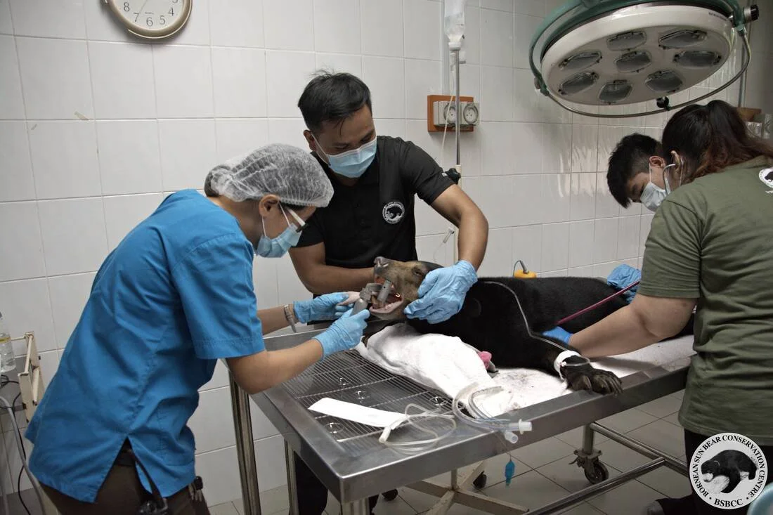 Sun bear dental check-up. We found one of the female bear had chronic gingivitis and dental tartar with numerous loose teeth.