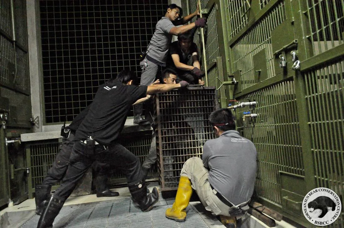 Staffs of BSBCC moving Sigalung into his new indoor den in the Bear House