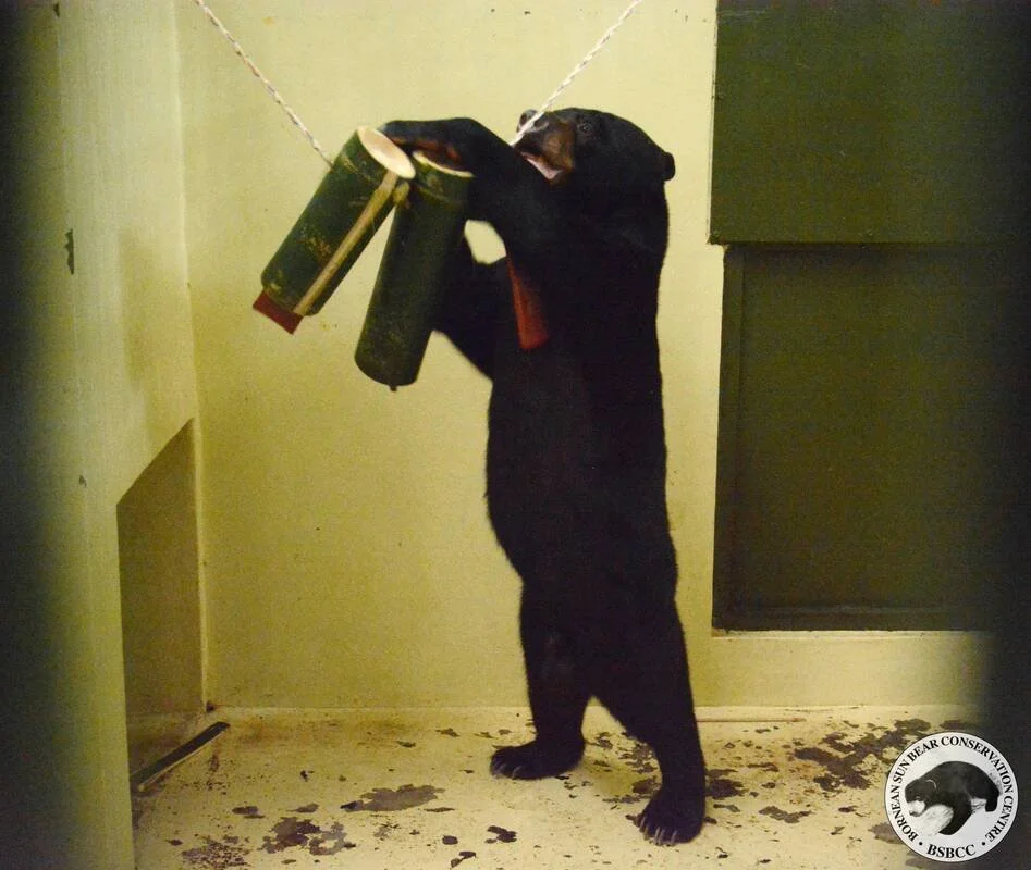 Sun bears? Honestly, they are ten times more adorable in real life than what you have seen posted on any social media or website. One of my favourite things to do is to feed them. The way they hold the food and chew it, is so adorable! I consider myself lucky because I got to see them face to face. My favourite sun bear is Simone, a female bear who loves climbing, observing, and relaxing. I consider her as the most obedient bear in BSBCC. My buddy keeper and I decided to make enrichment for her; we called it ‘The Flying Boat’.